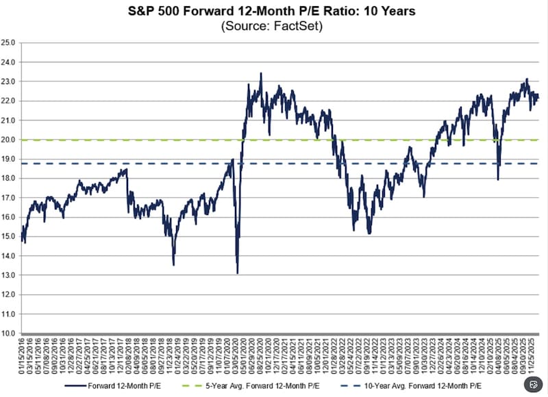 Actualmente, el S&P500 cotiza a 22 veces ganancias, apenas debajo de 23 veces ganancias que llegó a cotizar a mitad de noviembre.