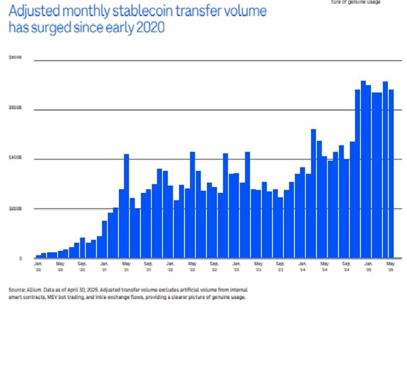 Según un reciente reporte publicado por Coinbase, las stablecoins facilitan la transferencia de dinero más rápida, actualizando sistemas financieros obsoletos. "Casi 1 de cada 5 ejecutivos de empresas de Fortune 500 considera las iniciativas on-chain como parte clave de la estrategia de su empresa, lo que representa un aumento interanual del 47 %", sostiene el estudio.