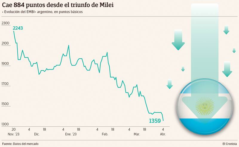 Desde la asunción de Javier Milei a la Presidencia de la Nación, el riesgo país acumula una caída de 564 puntos básicos. Desde finales de noviembre del año pasado, por el cambio favorable de expectativas tras el triunfo de Milei ante Sergio Massa en la segunda vuelta electoral, el índice acumula una baja de 884 puntos básicos.
