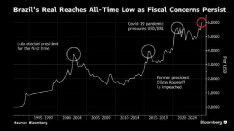 El real se devaluó hasta 1,1% en la apertura del mercado del jueves a 5,99 por dólar, debilitándose más allá del mínimo intradiario anterior de 5,97 por dólar, registrado en mayo de 2020 durante la pandemia de Covid. La moneda ha retrocedido un 19% este año, la mayor baja de los mercados emergentes.