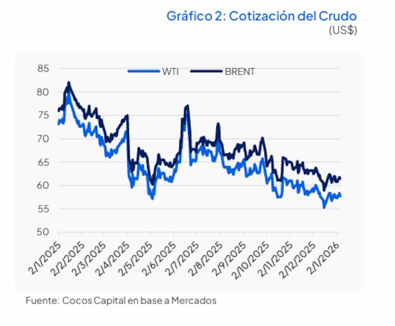 En el plano externo, la intervención de Estados Unidos en Venezuela generó volatilidad inicial, sobre todo en el mercado petrolero. Los temores a un shock de oferta por una eventual reactivación de la industria venezolana se disiparon rápidamente.