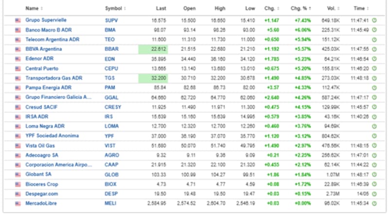 Otros papeles como Pampa Energía, Banco Macro y Telecom Argentina muestran avances de entre 4,5% y 4,4%.