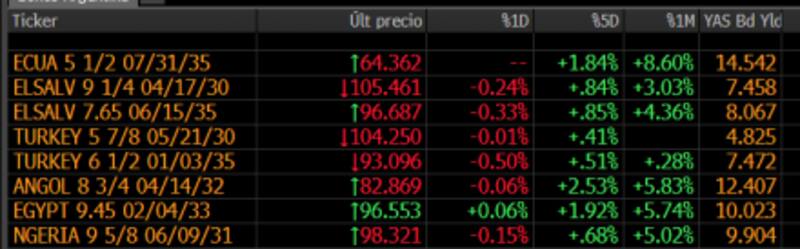 Por su parte, la deuda de Turquía retrocede 0,5%, y los de Angola caen 0,05%, similar a la baja que se ve en Nigeria, que operan en rojo en 0,15% en promedio.