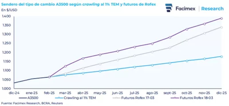 Desde Facimex Valores también señalan que la suba en los dólares futuros están ahora operando lejos del sendero consistente con el crawling peg al 1% TEM y con las tasas implícitas alcanzando máximos desde inicios de diciembre de 2023.