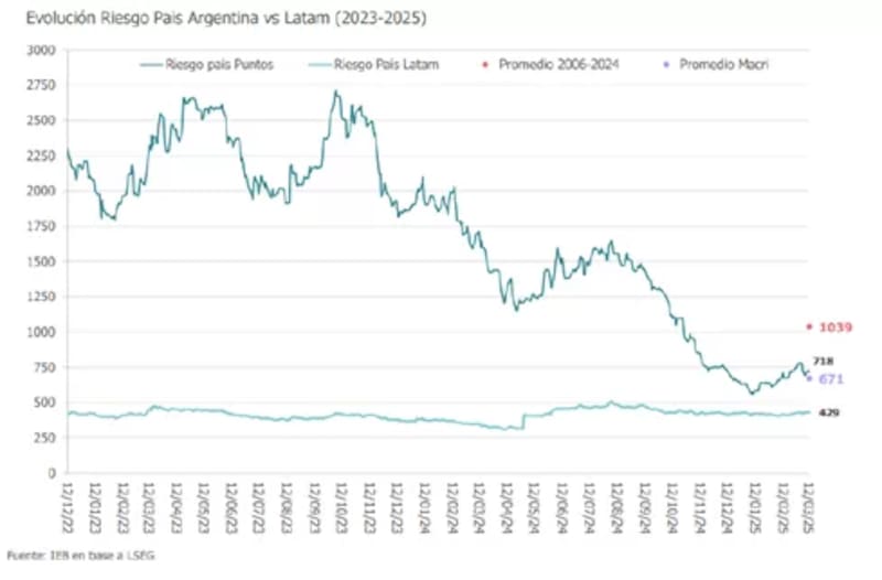 Con el riesgo país en 777 puntos, se ubica por debajo del promedio de largo plazo (2006 a 2024) de 1039 puntos, aunque por encima del de Macri, que fue de 671 puntos.