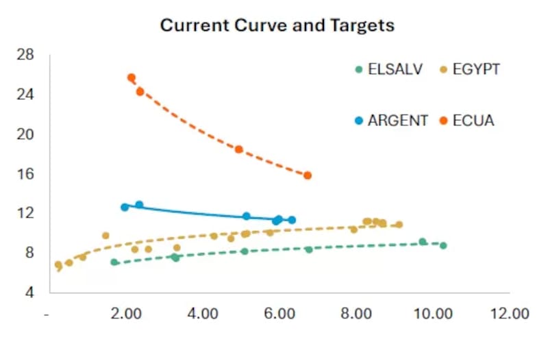 "Seguimos favoreciendo el extremo corto de la curva, ya que prevemos un potencial alcista similar (17% hasta fin de año), suponiendo que los bonos alcancen la curva de Egipto. Preferimos los bonos a corto plazo 2029 y 2030, ya que tienen un potencial a la baja significativamente menor (+3%/+4%) frente al -3% de los bonos 2035, suponiendo que los bonos vuelvan a la curva de octubre de 2024", detallaron.