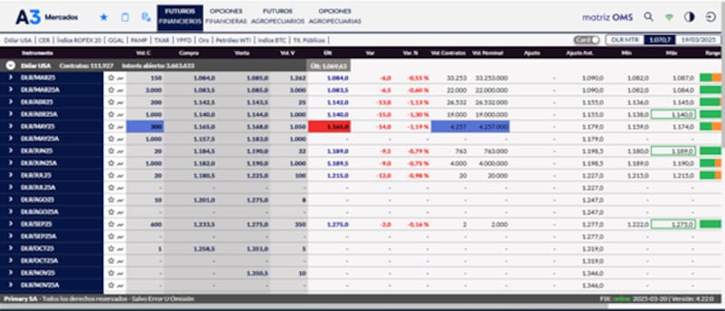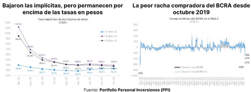 Los analistas de PPI indicaron que tras la baja en los contratos de dólar futuro, las tasas implícitas en los primeros tres contratos, que son los de mayor volumen operado, mermaron de 307,6% TEA a 77,5% (marzo), de 111,9% a 94,9% (abril) y de 69,4% a 63,8% (mayo).