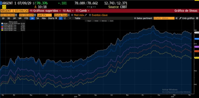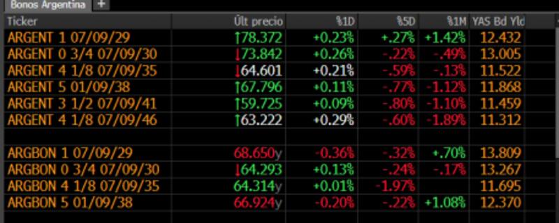 El Global 2029 (GD29) avanza 0,23%, mientras que el Global 2030 (GD30) gana 0,26%. En el tramo medio, los Globales 2035 y 2038 trepan 0,21% y 0,11% respectivamente, mientras que, en los más largos, estos suben 0,11% en el título a 2041 y 0,3% en el bono a 2046.