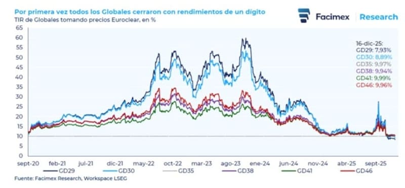 “Junto con las reformas estructurales en curso, estas medidas deberían impulsar una mayor compresión del riesgo soberano, actualmente en 559 puntos básicos. En un escenario a tres meses en el que la curva soberana se normaliza a una calificación crediticia B- (con rendimientos cercanos al 8%), los bonos GD35 y GD41 ofrecen el mayor potencial de crecimiento, en torno al 12%”, detallaron desde Research Mariva.
