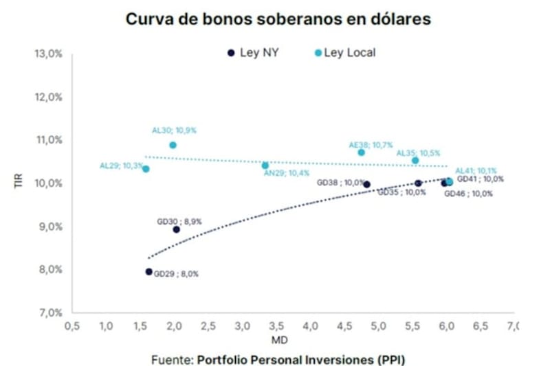 “En este contexto, vemos más valor en el tramo largo de la curva de dólares, como el GD35 que tiene mayor retorno potencial en caso de una compresión del riesgo país, por su mayor duration. De hecho, estos últimos días después del anuncio, los bonos más largos estuvieron bastante más firmes que los cortos y este comportamiento debería continuar”, sostuvo Casabal.