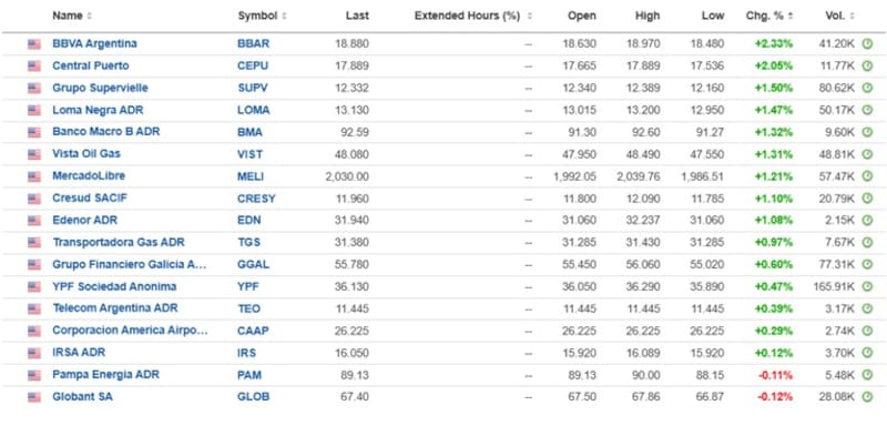 Otros papeles como Vista, Mercado Libre, Cresud, TGS, Edenor, Grupo Financiero Galicia, YPF y Telecom también suben, avanzando entre 0,3% y 1,2 por ciento.