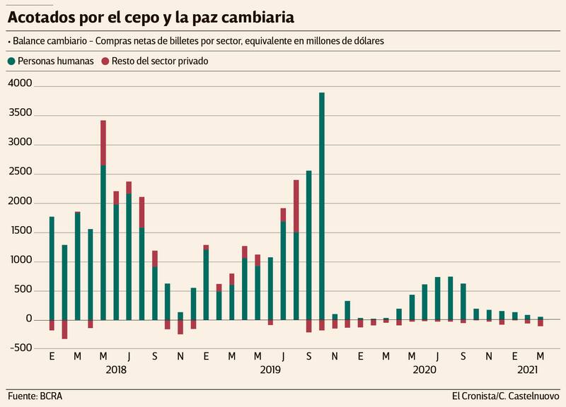 Además de revelar que solo 363.000 compraron billetes en marzo, el Informe Cambiario publicado por el BCRA mostró también que las "Personas humanas" compraron de forma neta u$s 175 millones. De ellos, unos u$s 108 millones responden a gastos efectuados con tarjetas por consumos con proveedores no residentes y u$s 59 millones a compras para atesoramiento. Esta última cifra representó un descenso de 36% respecto al mes previo.