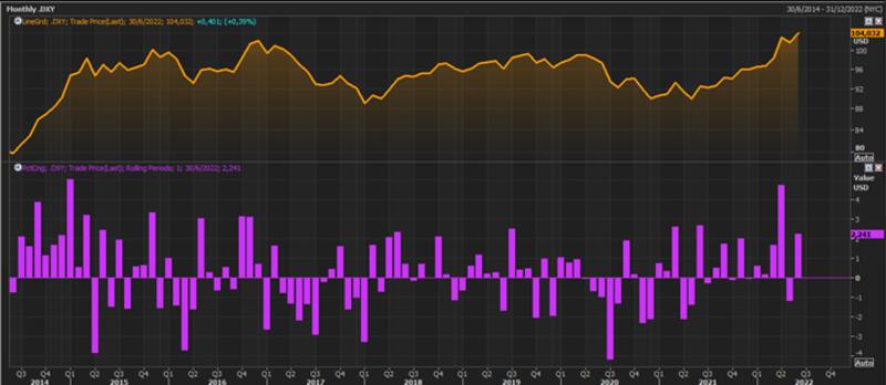 El Dólar Índex sube 2,3% en lo que va del mes y acumula un avance de 8,4% en el año. Este fortalecimiento del dólar a nivel global es el más fuerte desde 2015, año en el que llegó a ganar 9,2%, y con este avance, opera en su nivel más alto desde fines de 2002.