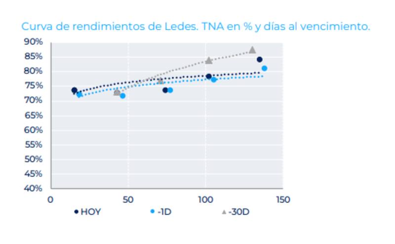 "Con una baja sostenida del IPC, aumenta la probabilidad de una posible baja de tasas por parte del BCRA. Y esto también se comenzó a percibir en algunas cotizaciones de Ledes, intentando aumentar la duration de las colocaciones para lograr capitalizar la posible compresión posterior al ajuste de la tasa", afirmó.
