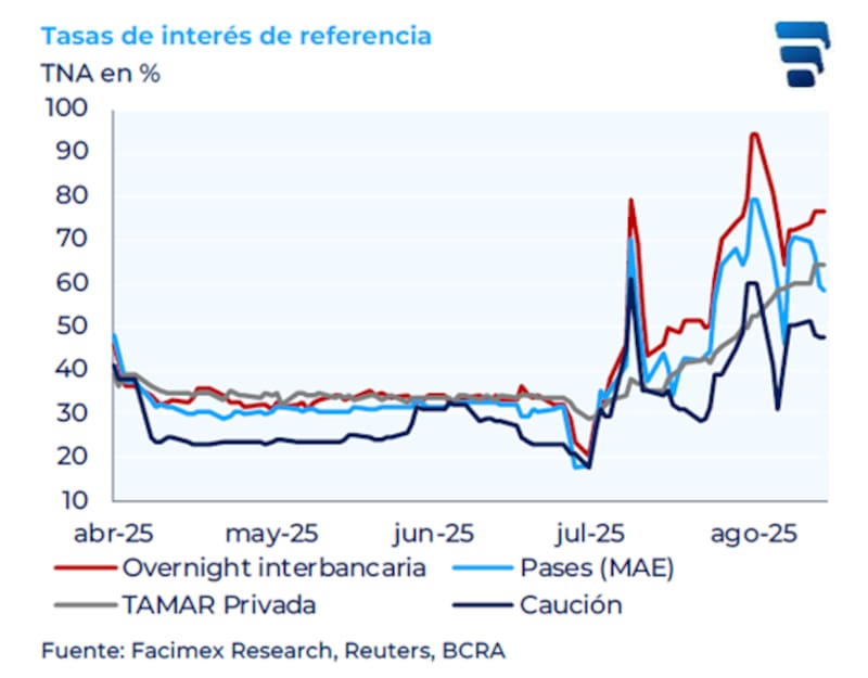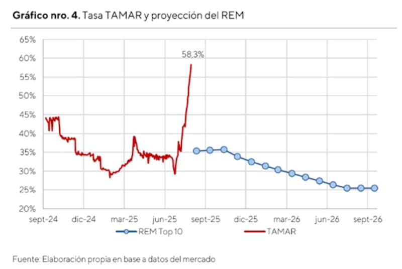 Diego Chameides, economista jefe de Galicia, explicó que los datos del REM son proyecciones recolectadas a finales de julio, cuando la TAMAR rondaba el 40%. "Hoy, esa tasa supera el 60% a partir del mayor apretón monetario, evidenciado durante agosto de la mano de cambios sustanciales en la política de encajes del BCRA", indicó.