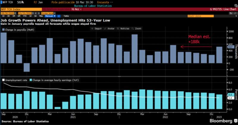 La contratación en EE.UU aumentó en enero y la tasa de desempleo cayó a un mínimo de 53 años, lo que muestra un mercado laboral inesperadamente dinámico que probablemente reforzará la determinación de la Reserva Federal de extender su serie de aumentos de las tasas de interés.