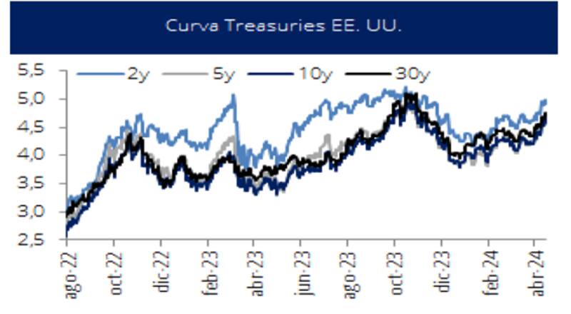 "Hoy, lo más probable según los futuros de la Fed Fund Rate, es que el mismo comience en julio o septiembre. Además, a principio de 2024, el mercado veía entre 6 y 7 bajas durante el presente año. Ahora, el mercado descuenta entre 1 y 2 bajas. Este cambio de expectativas ayuda a explicar la suba entre 60 y 70 bps de las tasas de la curva soberana de EE.UU.", comentó.