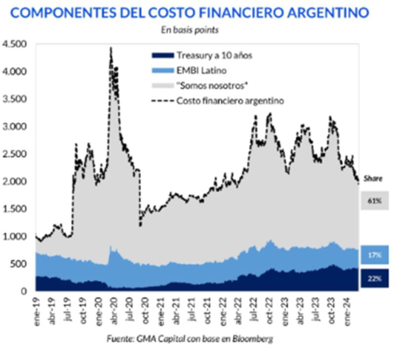 Actualmente, el 61% del riesgo país argentino está explicado por variables locales, mientras que el 17% esta explicado por el riesgo país latinoamericano y el 22% por los bonos del Tesoro americano.