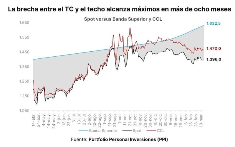 El hecho de que el dólar local haya operado estable, combinado con una banda cambiaria superior que sigue incorporando los últimos datos de inflación por encima de lo esperado, hizo que la distancia al techo de la misma se amplíe y se ubique en su valor más elevado en 8 meses.