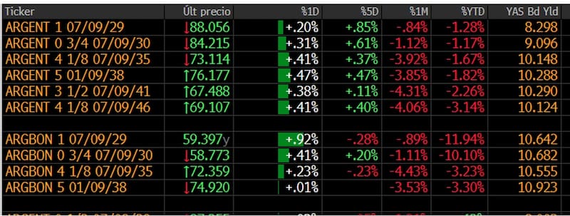Desde los máximos, todos los tramos de la curva se desplazan a la baja que hizo que los bonos argentinos ahora operen nuevamente con tasas de dos dígitos y que el riesgo país se ubique por encima de los 600 puntos básicos nuevamente.
