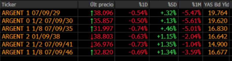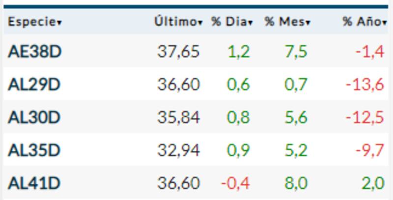 Entre los bonos locales, la planilla de ByMA mostró indicios positivos, con avances moderados en la mayoría de los casos. El AE38D sube 1,2%, mientras que el AL30D mejora un 0,8 por ciento.