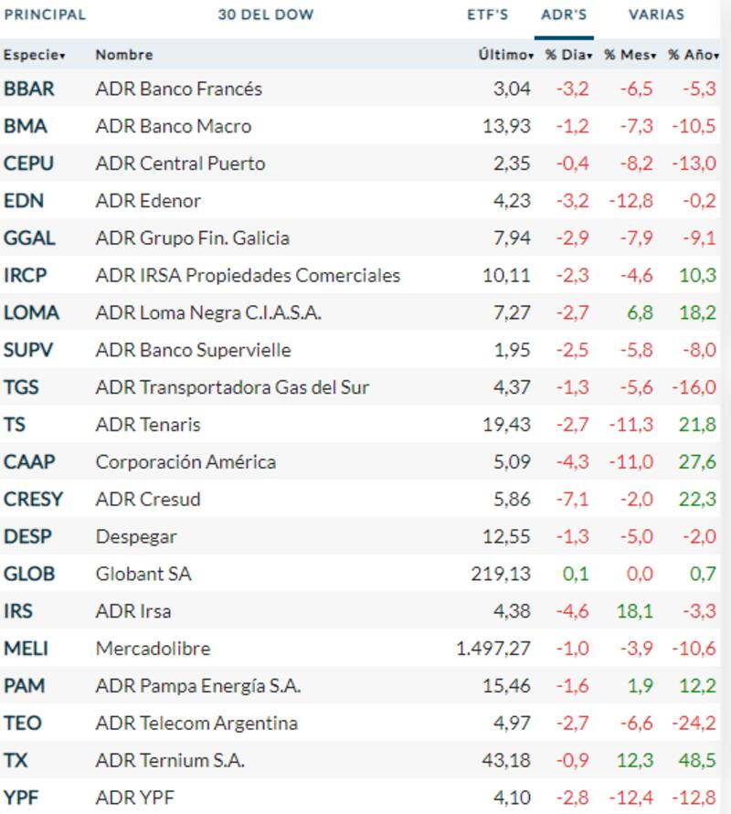 En tanto, la pizarra de ADR mostró velas rojas prácticamente en su totalidad. La mayor baja fue, al igual que en Buenos Aires, la de Cresud, que retrocedió 7,1 por ciento.