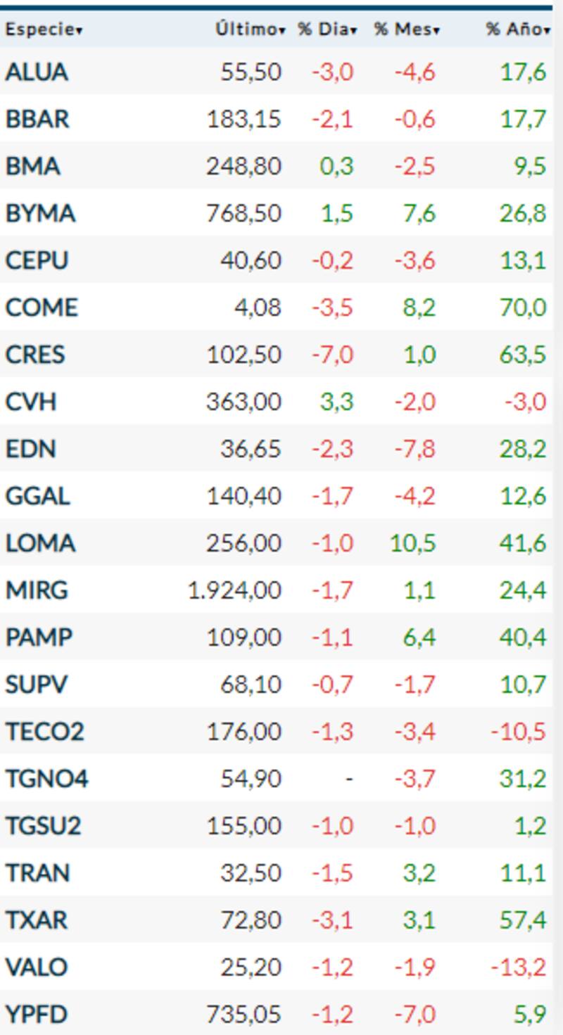 Salvo contadas excepciones, se vieron caídas en la gran mayoría de acciones del panel líder del Merval. La más profunda la sufrió Cresud, que retrocedió 7%, aunque en lo que va del año lleva una suba de 63,5% en pesos. El segundo mayor retroceso del día lo tuvo Sociedad Comercial del Plata (-3,5 por ciento).