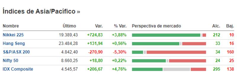 Así, las Bolsas asiáticas han cerrado al alza, impulsadas por las ganancias de ayer en Wall Street, cuando el Dow Jones subió cerca del 6%. El Nikkei se anotó un 3,88%. Los futuros de la Bolsa de Nueva York anticipan hoy descensos de más del 2%.