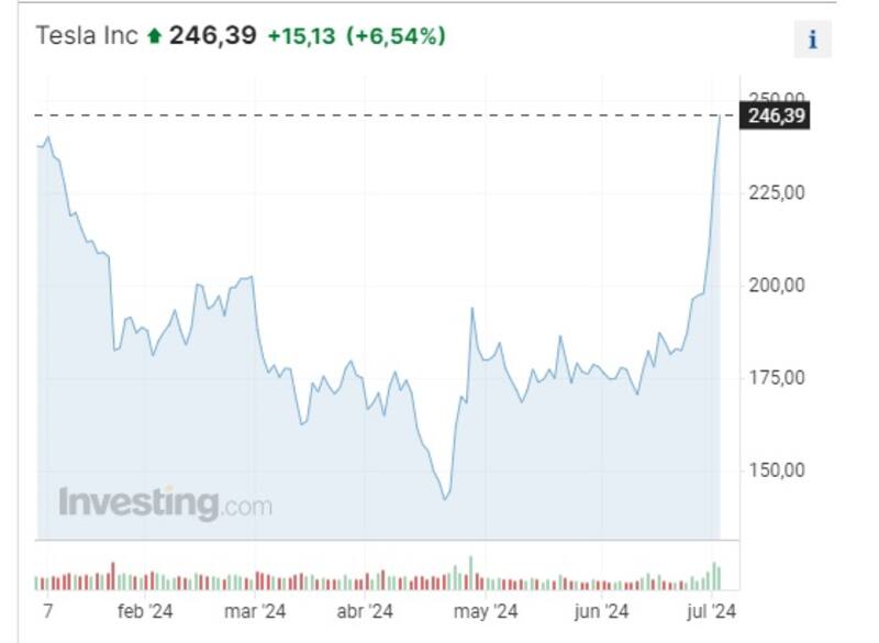 Los papeles de la empresa fundada por Elon Musk alcanzaron los u$s 246, su máximo valor en los últimos seis meses, revirtiendo fuertes pérdidas entre principios de año y fines de abril, cuando llegó a caer 43%. Por ese entonces, el mercado era muy pesimista sobre el futuro de los autos eléctricos y sobre la competencia que enfrentaba Tesla de automotrices chinas.