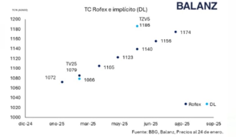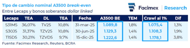 "Para inversores que busquen cobertura cambiaria, el instrumento adecuado es el bono dollar linked de junio (TZV25), que tiene un tipo de cambio nominal break even contra Lecaps que se ubica solo 1,9% por encima del nivel consistente con un crawling peg de 1% TEM hasta mitad de año. Es un costo que luce relativamente acotado", detallaron.