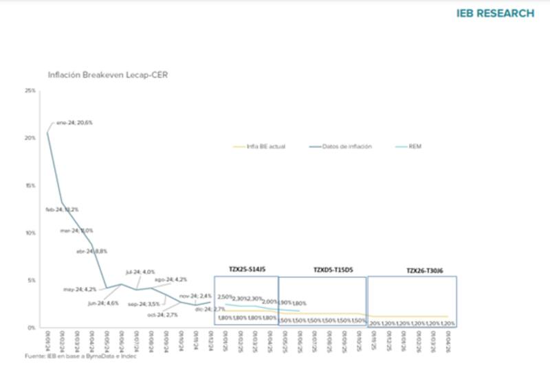 A su vez, los brek even de inflación se muestran aún más optimistas, con una expectativa inflacionaria de 1,5% hacia abril, bajando al 1,3% para fin de año y debajo de inflación mensual 1% los primeros meses de 2026.