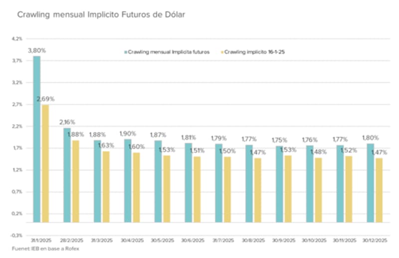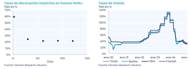 En cuanto a la dinámica devaluatoria, los futuros de Rofex pricean una dinámica cambiaria en torno a 1,90% mensual.