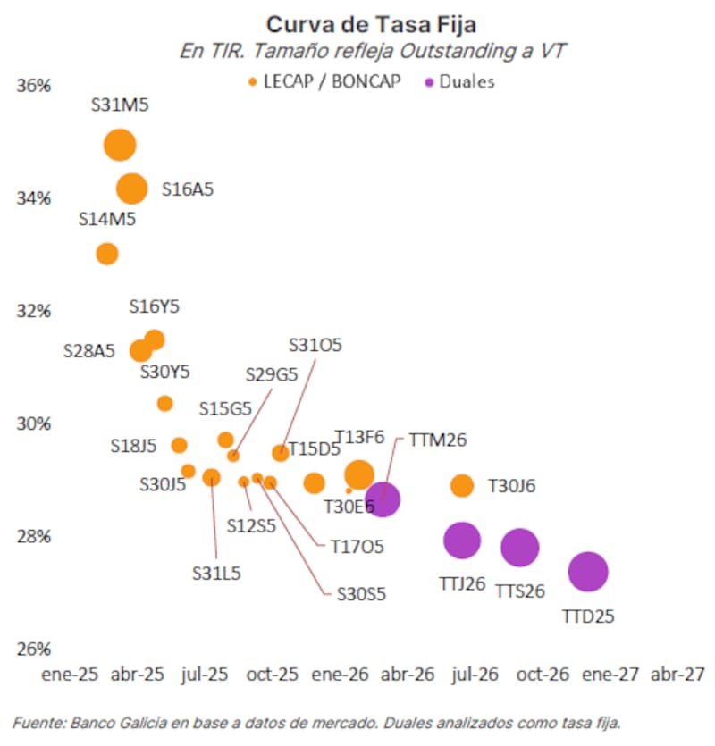 "Si el gobierno es efectivo en acumular reservas y continuar el proceso des inflacionario, el valor se encontrará en la parte larga de la curva de tasa fija en pesos. Puntualmente vemos una oportunidad en la parte larga de tasa fija o dual 2026", dijeron desde la mesa de trading de un banco de la city porteña.