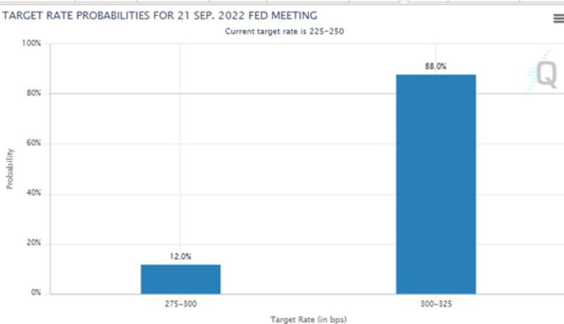 Los operadores esperan casi por completo otro aumento de la Reserva Federal de 75 puntos básicos en la reunión del 21 de septiembre, con un 88% de probabilidad de ver tal tamaño de suba.
