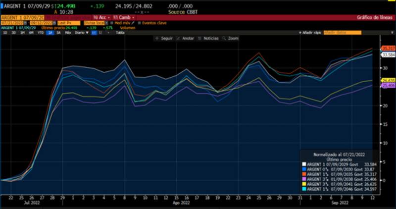 Si bien cae 22% desde sus máximos, aun sube 115% desde los valores alcanzados tras el canje de deuda en septiembre de 2020, cuando el Gobierno reestructuró u$s 65.000 millones con acreedores privados.