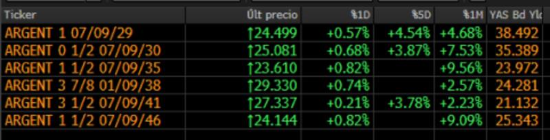 Por su parte, los Globales a 2035 y 2038 ganan entre 25% y 35% mientras que los Globales más largos, a 2041 y 2046 suben entre 26% y 34%.