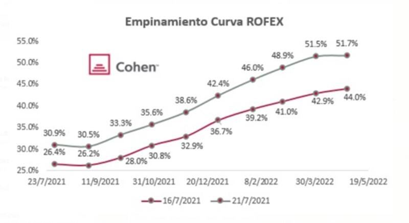 Esa mayor expectativa devaluatoria, sin embargo, no se había trasladado a la curva de futuros de Rofex, que se había mantenido sin grandes cambios. Pero en los últimos días también se dispararon las tasas de devaluación implícitas en la curva de Rofex, alineándose con las expectativas priceadas en la curva de los bonos dólar linked.