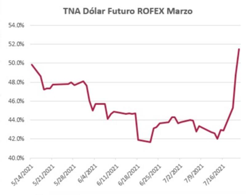 La curva de Rofex de dólar futuro se encuentra operando con tasas de 36% para octubre y se acelera al 52% para marzo.