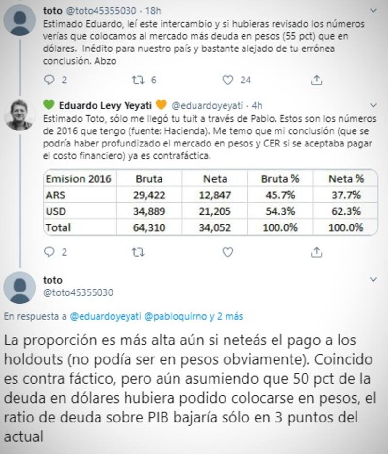 "Estimado Eduardo, leí este intercambio y si hubieras revisado los números verías que colocamos al mercado más deuda en pesos (55%) que en dólares. Inédito para nuestro país y bastante alejado de tu errónea conclusión. Abrazo", escribió.