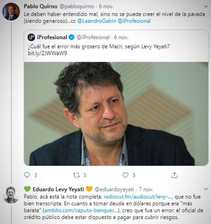 Caputo respondió a un hilo que inició su ex mano derecha Pablo Quirno, quien apuntó a una nota en la que el economista Eduardo Levy Yeyati tildaba de "error grosero de Macri" al haber tomado deuda en dólares "porque era más barata".