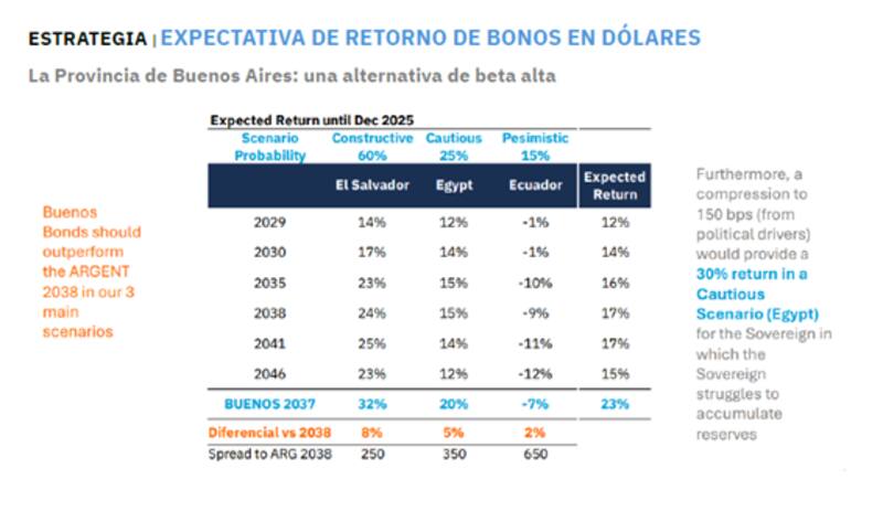 "Se trata de una apuesta agresiva para aprovechar la historia constructiva del país junto con una mejora para la perspectiva de la provincia. Planteando el caso más optimista, si el riesgo país converge a los niveles más bajos de 2017 y el spread entre la curva soberana y el bono de la provincia vuelve a situarse en torno a los 200 puntos básicos, el BUENOS37 tendría un retorno a 12 meses de casi 45%, pasando de un rendimiento actual del 14,7% a uno cerca del 8%", señaló.