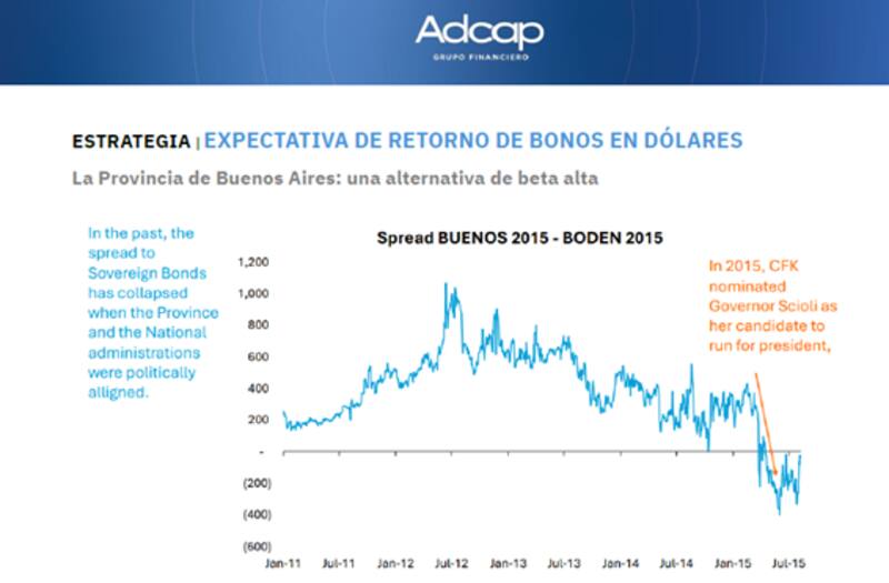 Los analistas de Adcap Grupo Financiero explicaron que, en el pasado, el spread de tasas entre los bonos de la Provincia de Buenos Aires y el de Nación comprimieron a cero cuando los dos gobiernos representaban el mismo partido político, es decir, en la experiencia del macrismo en Nación y de María Eugenia Vidal en la provincia.