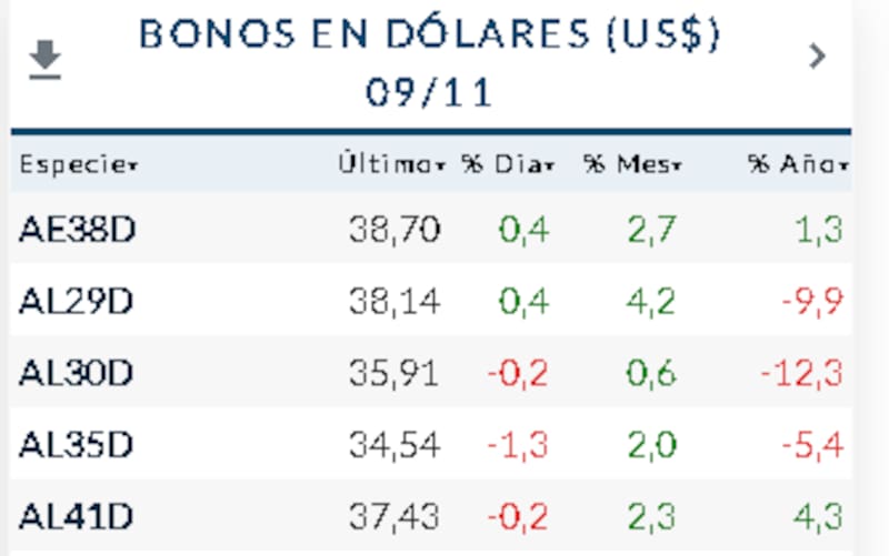 Entre los ley local, la planilla de ByMA mostró resultados mayormente negativos. La baja más fuerte la sufrió el AL35D (-1,3%), mientras que el AE38D y el AL29D recuperaron un 0,9 por ciento.