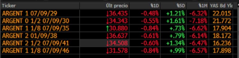 En tanto, el bono de referencia, el AL30D, cedió un 0,2 por ciento y muestra una TIR de 22,18 por ciento.