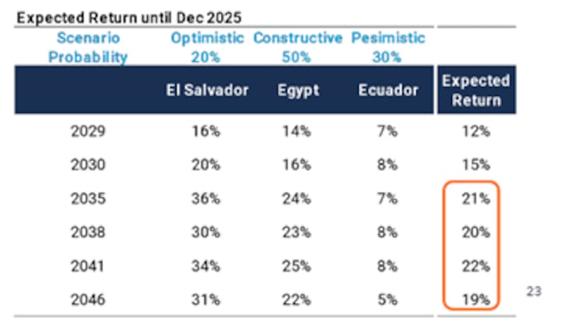 En consecuencia, redujeron la probabilidad del escenario de que la Argentina converja rápidamente hacia otros créditos similares, como "El Salvador" ya que las metas de acumulación de reservas lucen menos alcanzables en próximas semanas.