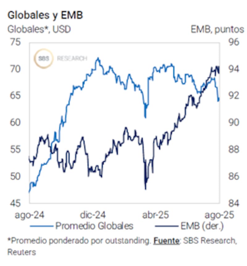 Además, determinó que, ante un escenario intermedio, con riesgo país alrededor de 650 pb, los retornos se moderarían a un rango de 7% a 13%, mientras que una descompresión hacia los 1000 pb implicaría pérdidas de entre 5% y 10%, más pronunciadas en la parte larga de la curva.