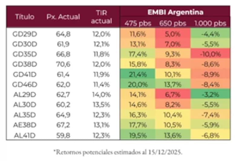 "Los bonos argentinos continúan mostrando una favorable relación riesgo-retorno para inversores con horizontes de mediano y largo plazo. Al analizar distintos escenarios para la deuda soberana en dólares, seguimos identificando valor en el tramo largo de la curva bajo ley NY, destacando al GD35 y GD41 como las opciones más atractivas", dijeron.