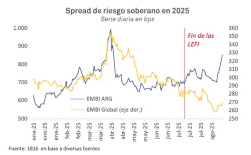 "El sesgo de la política monetaria y cambiaria, así como las herramientas elegidas por el equipo económico para ejecutar ese sesgo son los elementos centrales para explicar la ampliación del spread del crédito soberano en el último mes y medio. De ser así, un triunfo electoral del Gobierno puede ser condición suficiente para que el riesgo país se acerque a niveles que permitan recuperar el acceso al mercado", estimaron desde 1816.