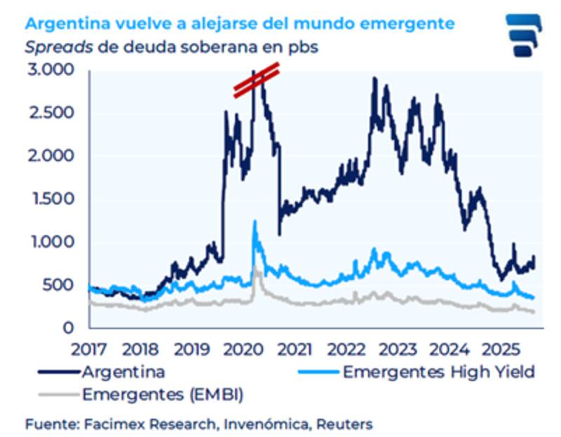 Visto de otra manera, el riesgo país argentino se disparó a máximos desde abril, alcanzando los 850 puntos, mientras que el EMBI global (riesgo país global), siguió su proceso de baja hasta los 270 puntos.