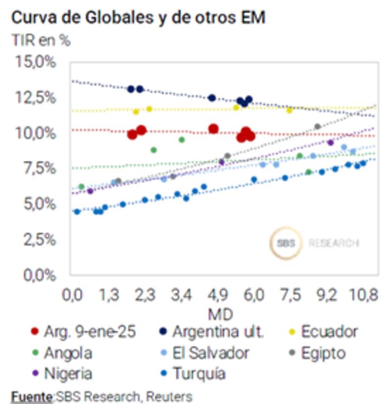 "Las fuertes caídas en la curva soberana hard-dollar ampliaron el spread con el universo comparable, que cada día se ve más lejano. Tanto el universo B- como los países de la región continúan siendo demandados, mientras que la curva argentina sigue a contramano. Si luego de la corrección del Liberation Day la curva argentina hubiese acompañado el movimiento de pares como Angola o Pakistán, hoy estaría rindiendo en torno al 9%", indicaron.